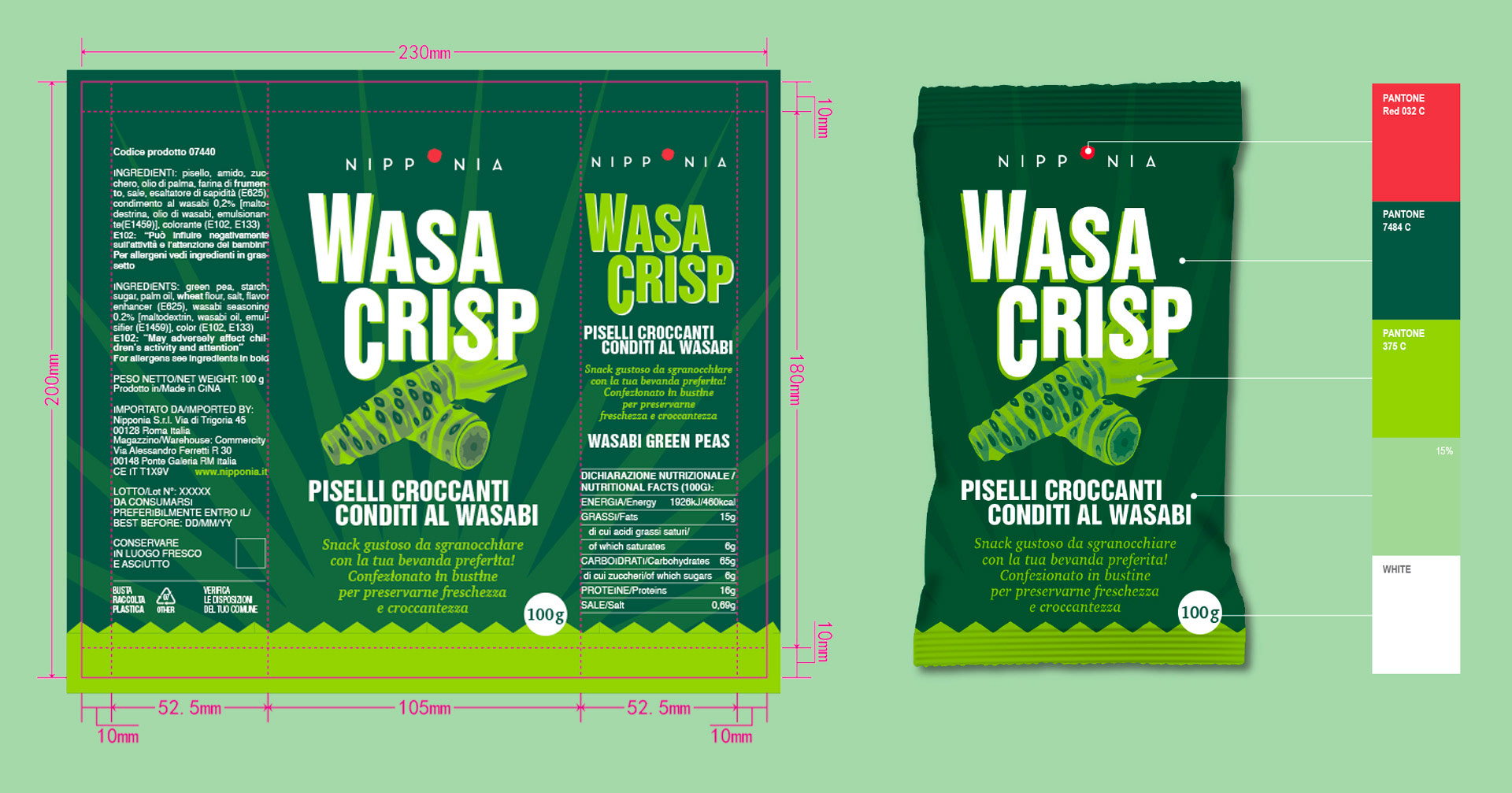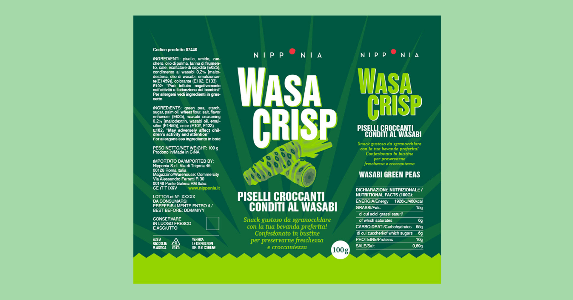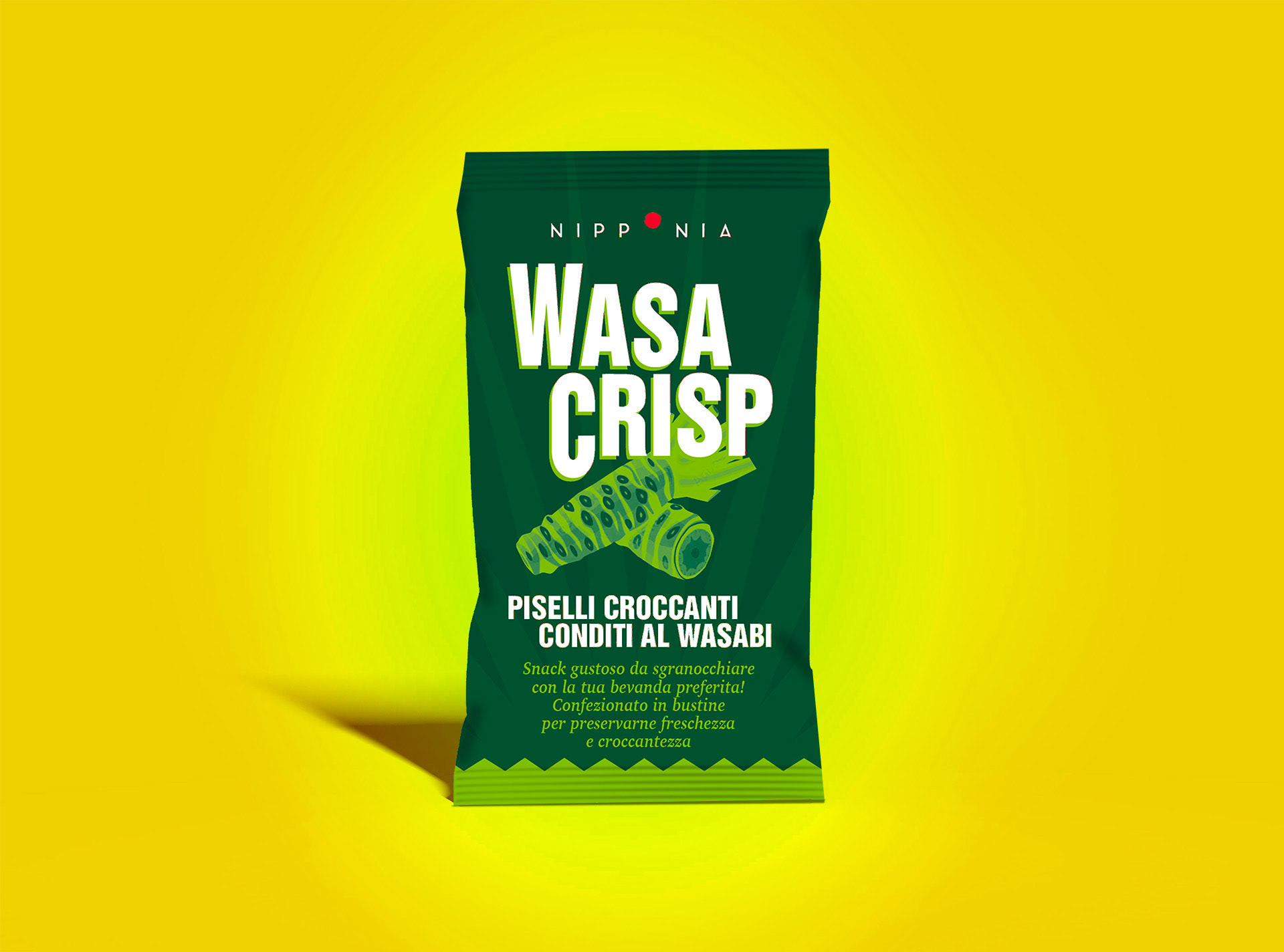Progetto grafico e illustrazione per la nuova confezione di Wasa Crisp a marchio Nipponia, snack di piselli croccanti conditi al wasabi.