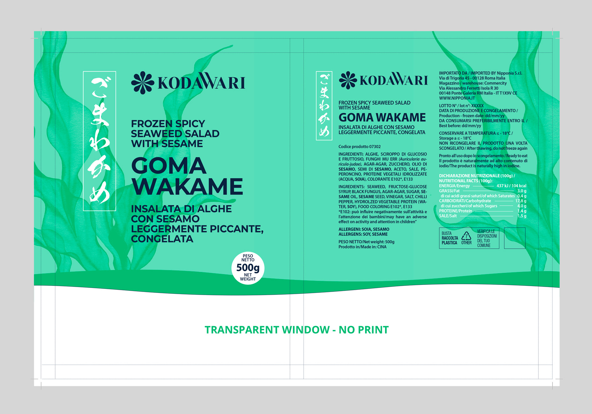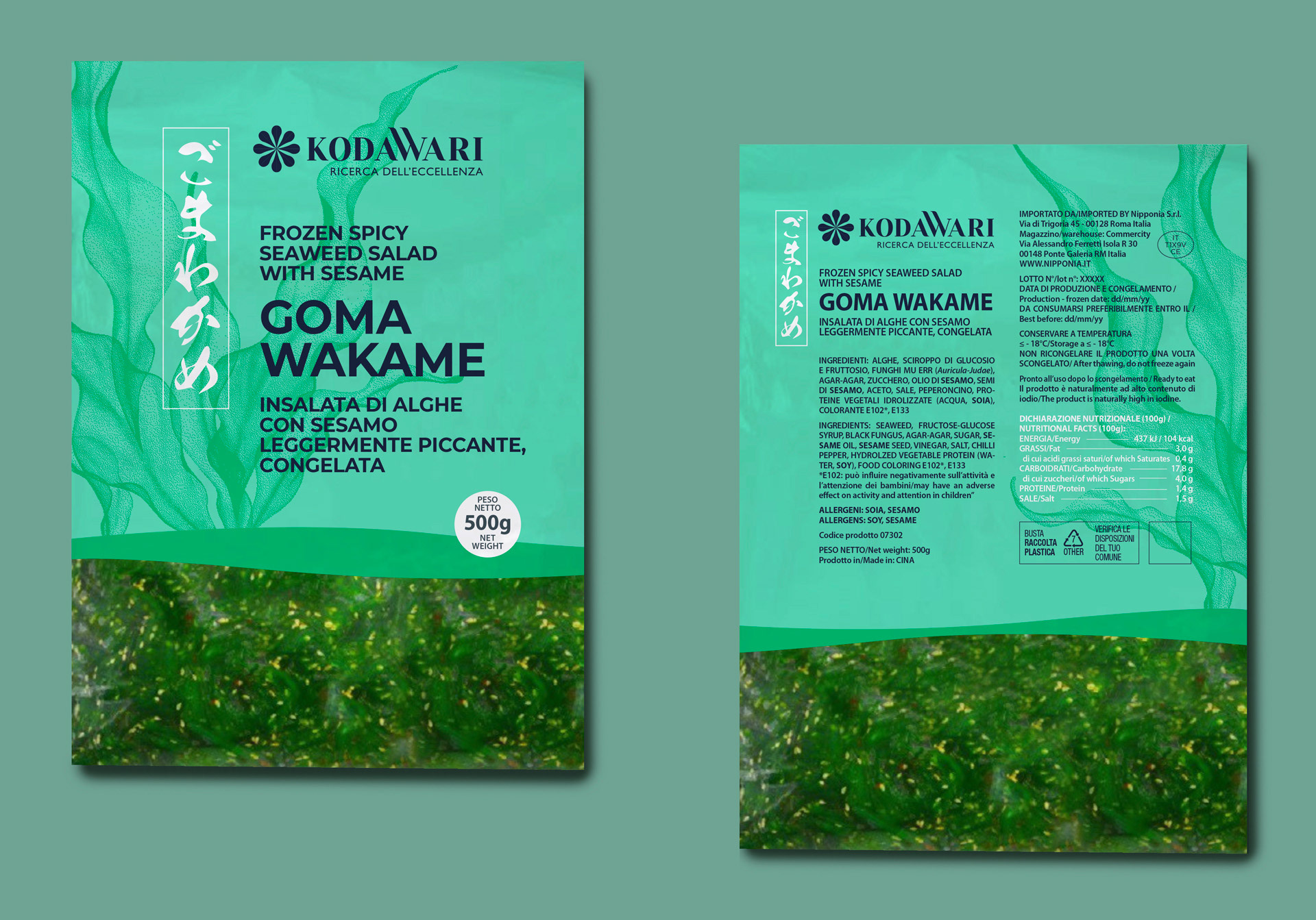 Progetto grafico per la nuova confezione di Goma Wakame a marchio Kodawari, insalate di alghe con sesamo leggermente piccante.