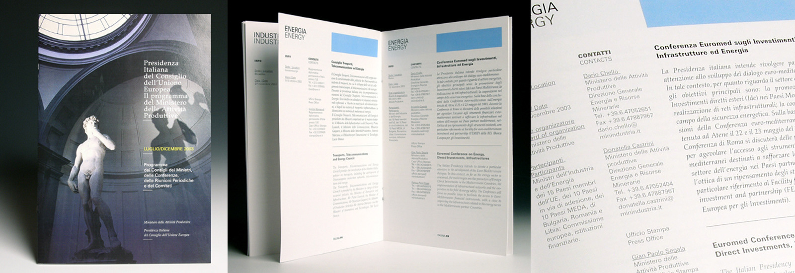 Progettazione grafica e realizzazione, per il Ministero delle Attività Produttive nel periodo di presidenza europea, di un'agenda suddivisa in temi e appuntamenti quotidiani che spaziano dall'energia all'industria.